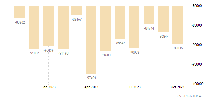 Il dato preliminare di ottobre relativo alla bilancia commerciale di beni è pari a -89,84 miliardi di dollari, contro un dato di settembre di -86,84 miliardi di dollari (rivisto da -85,78 miliardi di dollari). Il dato è rilasciato dall’U.S. Bureau of Economic Analysis.