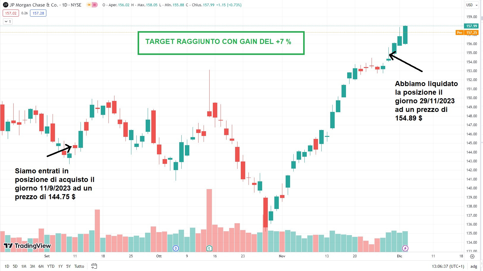 Abbiamo acquistato il titolo JPMORGAN CHASE, simbolo: JPM, codice Isin: US46625H1005 il giorno 11 settembre 2023 sul mercato borsistico NYSE di New York, al prezzo di 144,75 $ con la strategia Azioni Internazionali del Portafoglio Storico. Dopo poco più di due mesi ed esattamente il giorno 29 novembre 2023, il titolo è riuscito a toccare il nostro livello di target a 154,89 $ al quale abbiamo venduto guadagnando un ottimo + 7,00% !!