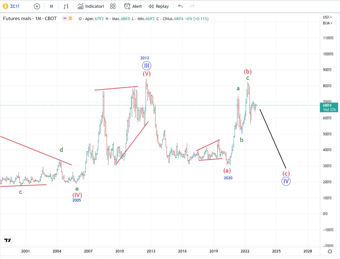 Non possiamo dire se il grano ha terminato l’onda(4) o se mancano altre suddivisioni. In ogni caso la successiva onda (5) dovrebbe portare i prezzi più in basso in area 625-630$.
