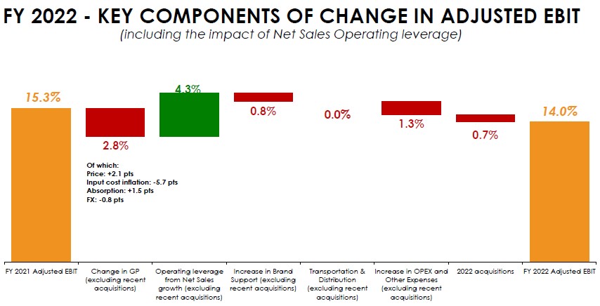 Si prevede che le vendite nette per l'intero anno 2023 cresceranno tra il +5% e il +7% a valute costanti guidate da prezzo, mix e volumi. Prevediamo di migliorare l'EBIT rettificato e il margine EBIT rettificato nel 2023, con un margine di profitto lordo in crescita, parzialmente compensato dai continui investimenti nelle nostre operazioni e nel supporto del marchio, volti a guidare la nostra ambizione Horizon di fornire una crescita redditizia a lungo termine. Il Free Cash Flow dovrebbe superare i 200 milioni di euro nel 2023, per il quinto anno consecutivo.