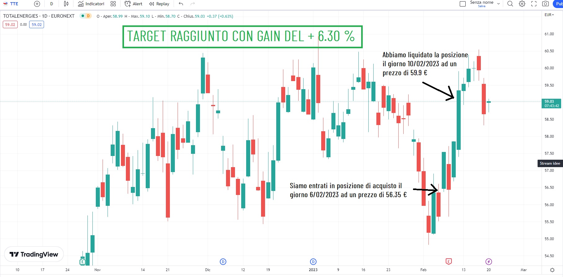 Come potete vedere dal grafico siamo entrati in posizione di acquisto il giorno 6 febbraio 2023 ad un prezzo di 56.35 € e dopo soli 5 giorni di contrattazione sui mercati abbiamo liquidato la posizione ad un prezzo di 59.9 €.