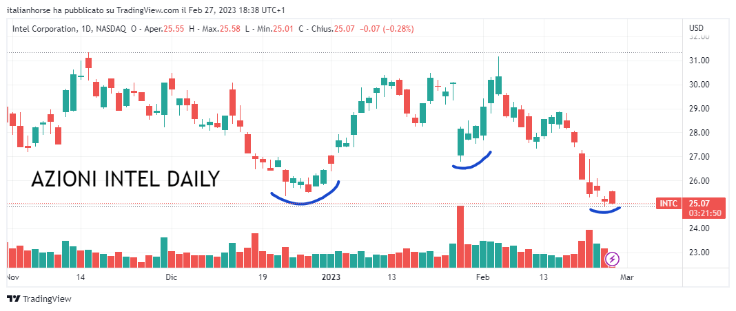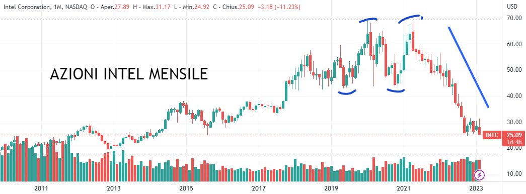 AZIONI INTEL (Codice isin US4581401001): Terza azione (e non ultima) quotata al Nasdaq per i buy di lunedì. Intel si presenta come il maggiore produttore di chip mondiale. L’azienda progetta e produce microprocessori per i mercati dei personal computer e dei data center ed è stata pioniera di diverse innovazioni del settore di appartenenza che, anche in questo caso, è uno dei leader del mercato.