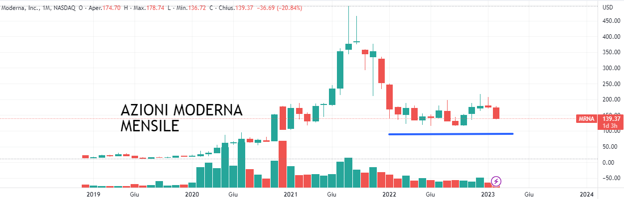 AZIONI MODERNA (Codice isin US60770K1079): E torniamo nelle quotazioni Nasdaq con azioni Moderna. Moderna è una biotecnologia in fase di sviluppo commerciale fondata 13 anni fa. La tecnologia denominata mRNA dell’azienda è stata presto convalidata con il vaccino Covid-19 autorizzato negli Stati Uniti nel dicembre 2020 e poi esportato in tutto il mondo.