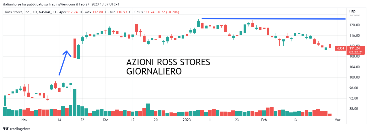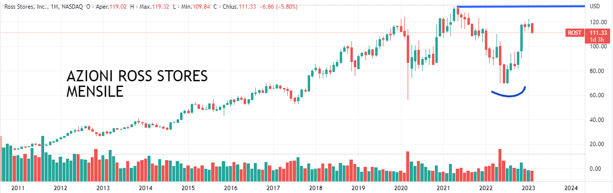 AZIONI ROSS STORES (Codice isin: US7782961038). Rimaniamo ancora nel Nasdaq con azioni Ross Stores. L’azienda, leader nella vendita al dettaglio di abbigliamento e moda per la casa, offre prodotti con prezzi inferiori del 20-70% rispetto ai rivenditori tradizionali, posizionandosi dunque come proposta allettante per tanti consumatori che sperano di risparmiare.