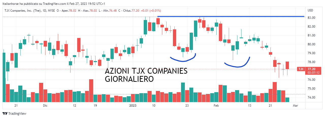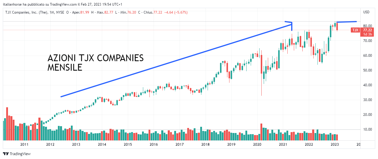 AZIONI THE TJX COMPANIES (Codice isin US8725401090): Passiamo a un’azione quotata al NYSE con azioni The TJX Companies. L’azienda, leader nella vendita al dettaglio di abbigliamento e articoli per la casa, acquista scorte da oltre 21mila venditori in tutto il mondo, riuscendo a rivendere a prezzi inferiori rispetto ai suoi competitor (una situazione simile a quella appena descritta con Ross Stores).