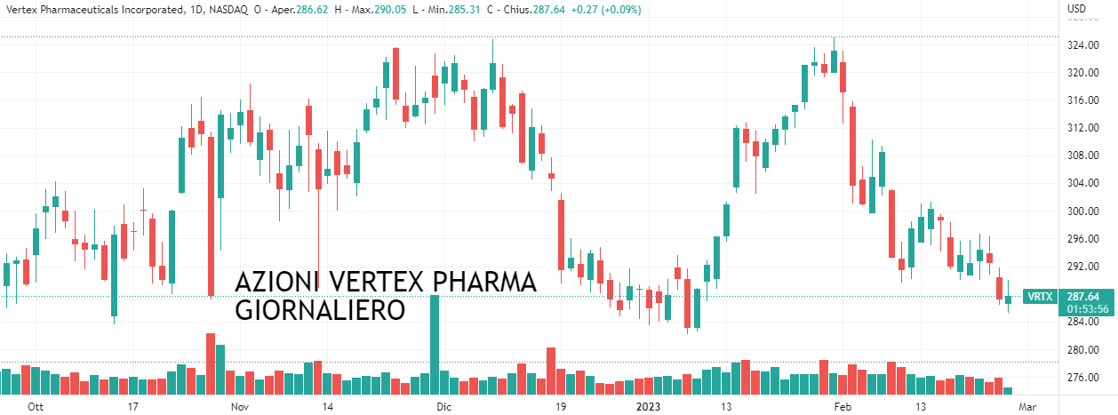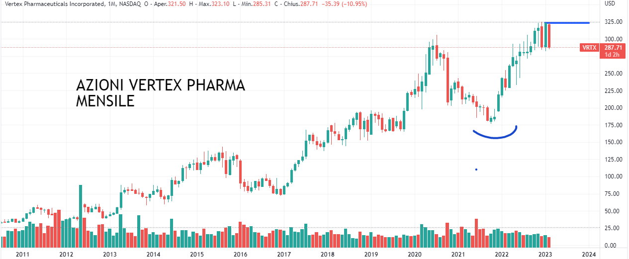 AZIONI VERTEX PHARMA (Codice isin US92532F1003): E chiudiamo questo articolo con un’altra azione quotata al Nasdaq: azioni Vertex Pharma. Di nuovo, sul grafico mensile vediamo che ci troviamo al punto di una rottura di massimi storici (che vediamo naturalmente stabilizzata nel giornaliero con una discesa).