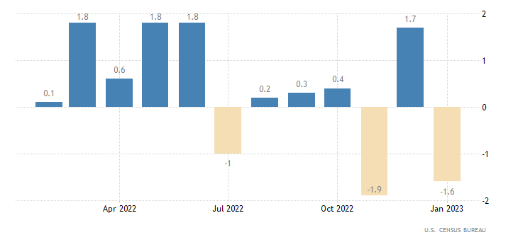 Gli ordini di fabbrica a livello mensile a gennaio segnano un -1,6% invertendo rotta rispetto al mese precedente, a dicembre infatti era stato registrato un +1,7% (rivisto da +1,8%); tuttavia la contrazione di gennaio è più contenuta del -1,8% indicato dal consensus. Il dato è rilasciato dall’U.S. Census Bureau.