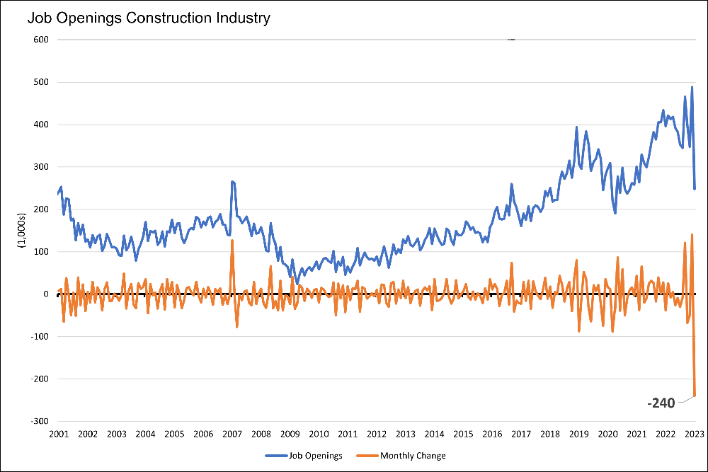 Anche nel settore più a rischio dell’economia a stelle e strisce, quello delle costruzioni abitative, le nuove offerte di lavoro si sono dimezzate a gennaio con un calo netto di 240.000 offerte. Questo potrebbe essere un sintomo che la domanda di lavoratori nel settore immobiliare residenziale si sta riducendo, via via che i cantieri vengono completati e chiusi, e quelli nuovi scendono di numero.