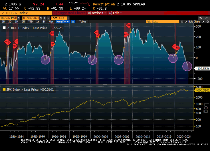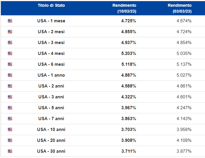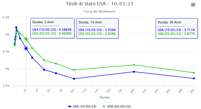 I movimenti sui tassi nella scorsa settimana, hanno portato in dote nuovi record di inversione delle curve dei tassi, con il 2 anni che è andato a quotare il 5,085% (dal 13 luglio 2007 che non si vedevano tali rendimenti) mentre la parte lunga è rimasta inchiodata, con il risultato che abbiamo un nuovo record di inversione tra il 2-10Y USA che è andato a superare i -100 bps in intraday, ed il 2-30Y a ben 117 bps. Era da 42 anni che non si vedevano questi livelli. Poi con l’uscita della notizia del fallimento della Silicon Valley Bank, i rendimenti si sono ben ridimensionati.
