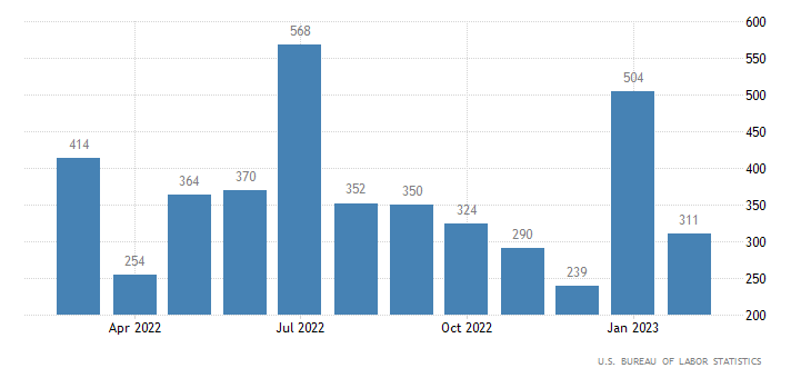 I posti di lavoro creati nel settore non-agricolo pubblico nel mese di febbraio sono stati 311 mila, oltre il consensus di 205 mila e in deciso calo rispetto ai 504 mila del mese di gennaio (rivisti da 517 mila).