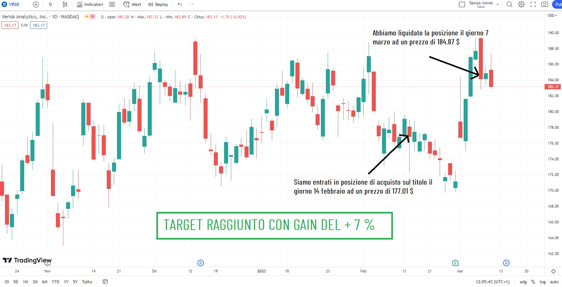 Come potete vedere siamo entrati in posizione di acquisto sul titolo il giorno 14 febbraio 2023 ad un prezzo di 177.01 $ e dopo pochi giorni di contrattazione, esattamente il giorno 7 marzo 2023, il titolo ha raggiunto il livello del nostro target a 184.87 $.