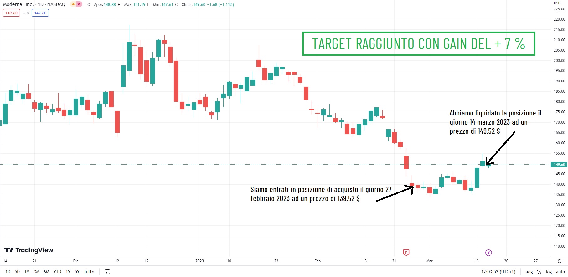 Come potete osservare dal grafico, siamo entrati in acquisto del titolo lo scorso 27 febbraio 2023 ad un prezzo di 139.52 $ e solo dopo pochi giorni di contratttazione abbiamo liquidato la posizione ad un prezzo di 149.29 $, raggiungendo l’obiettivo target e guadagnando un ottimo + 7 % sul titolo.
