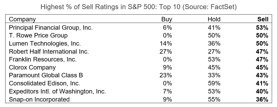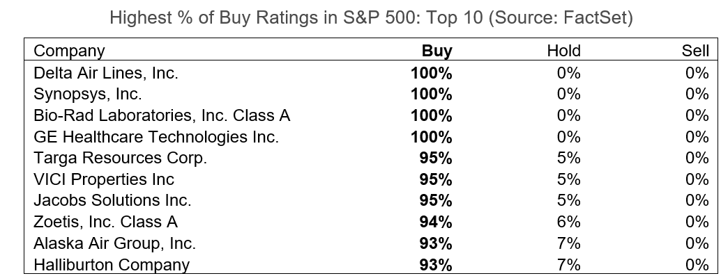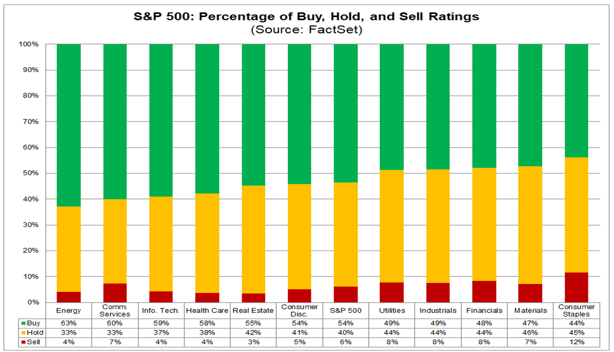 Ma vediamo nel dettaglio dove sono posizionati gli analisti più ottimisti e pessimisti in termini di rating sui titoli dell'S&P500. Complessivamente, ci sono 10.966 rating su codesti titoli dei quali, il 53,5% sono rating Buy, il 40,3% sono rating Hold e il 6,2% sono rating Sell, quindi non propriamente in attesa di una recessione.