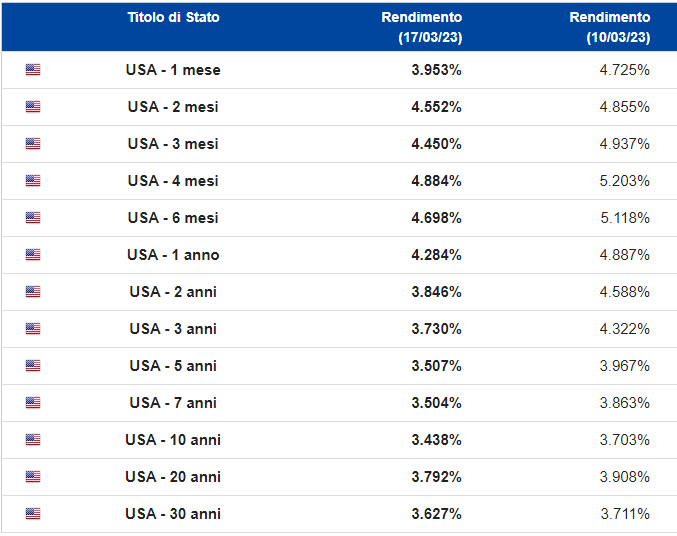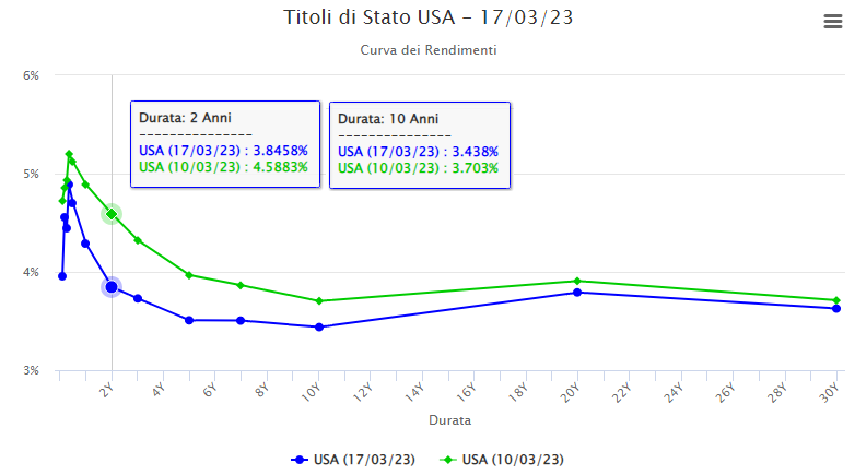 Anche i movimenti sui tassi hanno, de facto, ribaltato tutte le posizioni record raggiunte due settimane fa. Tutta la curva dei rendimenti dei Treasury è abbondantemente sotto il 4% (2 anni al 3.846%, 76 bps sotto i Fed Funds), mentre la probabilità di 25 bps di rialzo da parte della FED nella giornata di mercoledì prossimo, supera di poco il 50%.