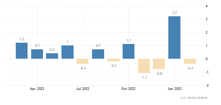 Le vendite al dettaglio a livello mensile a febbraio calano dello 0,4%, contrazione appena più marcata del -0,3% indicato dal consensus. A gennaio era stata registrata una crescita del 3,2% (rivista da +3,0%). Il dato è rilasciato dall’U.S. Census Bureau.