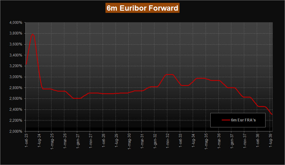 La lettura della ZC-Yield Curve mostra un’ulteriore contrazione dei rendimenti su tutto il tratto della curva rispetto alla scorsa analisi. Infatti, rispetto alla scorsa lettura il rendimento della scadenza a 10 anni scende in area 2,89% rispetto al 3,02% precedente, mentre la scadenza trentennale si porta ora in area 2,29% rispetto al 2,42% precedente. Sostanzialmente stabile la conformazione della curva anche se si inizia a percepire qualche cambiamento. Per ora rimane invertita ma si restringe decisamente il differenziale 10Y-2Y che è passato agli attuali -32 bps da precedenti -70 bps. In discesa anche il tratto a breve, con la curva che evidenzia ora un massimo di rendimento sulle scadenze di inizio 2024 in area 3,60% rispetto al 4,00% della scorsa analisi. Si modificano anche le previsioni dei tassi forward su Euribor 6 mesi in particolare sulle scadenze a breve. La curva rimane impennata sulla parte a breve ma vede ora tassi verso un massimo in area 3,80% per inizio 2024 rispetto alla precedente lettura al 4,50%, per poi scendere nell’intervallo 2,80% - 2,60% a partire da fine 2024.