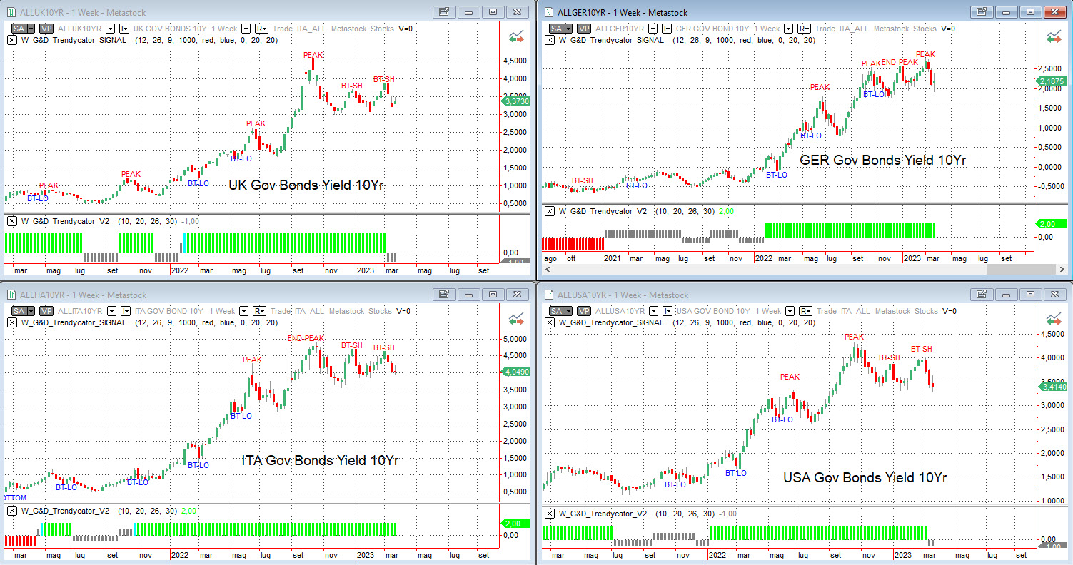 Osservando – a livello di analisi integrata – le curve dei rendimenti dei principali benchmark decennali si notano i primi segnali di potenziale cambiamento in particolare sull’area sterlina e dollaro Usa. L’area UK vede ora il rendimento per il GILT in area 3,37% in discesa dal precedente 3,77% e con Trendycator ora in stato NEUTRAL. In contrazione anche i rendimenti del BUND, che si porta ora in area 2,18% rispetto al precedente 2,63% e con Trendycator che per ora resta ancora in stato LONG. Calano anche i rendimenti del nostro Btp decennale, ora in area 4,05% rispetto al precedente 4,40%, con uno spread in miglioramento ora poco sotto area 180 bps; Trendycator ancora LONG anche su questo mercato. Infine, l’area USA con i rendimenti del Treasury decennale che scendono in area 3,40% rispetto al precedente 3,90% e con Trendycator che cambia stato e passa ora a NEUTRAL dal precedente LONG.