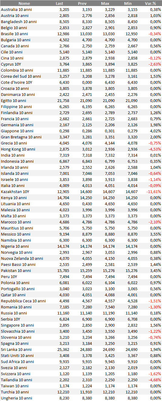Consueta sezione dell’analisi sui mercati obbligazionari, con l’introduzione sotto forma di ranking dei bond governativi mondiali con qualunque rating. In alcuni casi, per alcuni emittenti o per alcune valute, il rapporto rischio/rendimento di questi bond può essere anche piuttosto speculativo. Il ranking considera i bond benchmark decennali in tutte le valute di emissione.