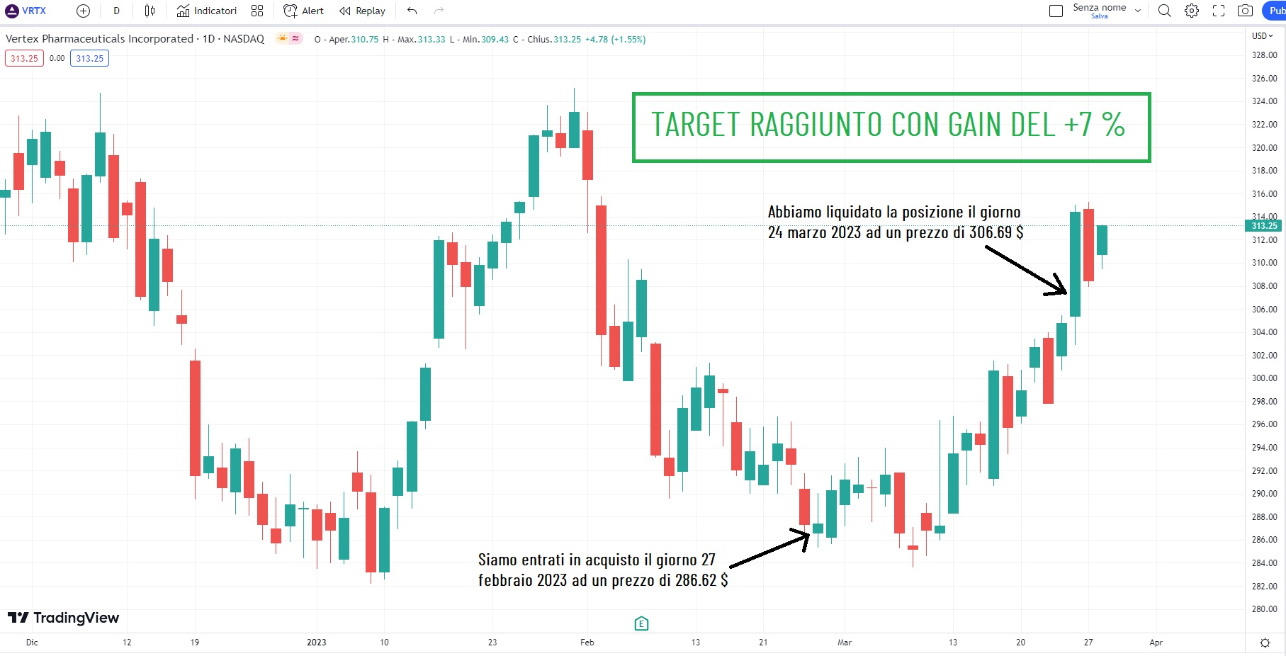 Oggi, dopo quasi un mese di contrattazione, siamo andati a target con Vertex Pharmaceuticals.