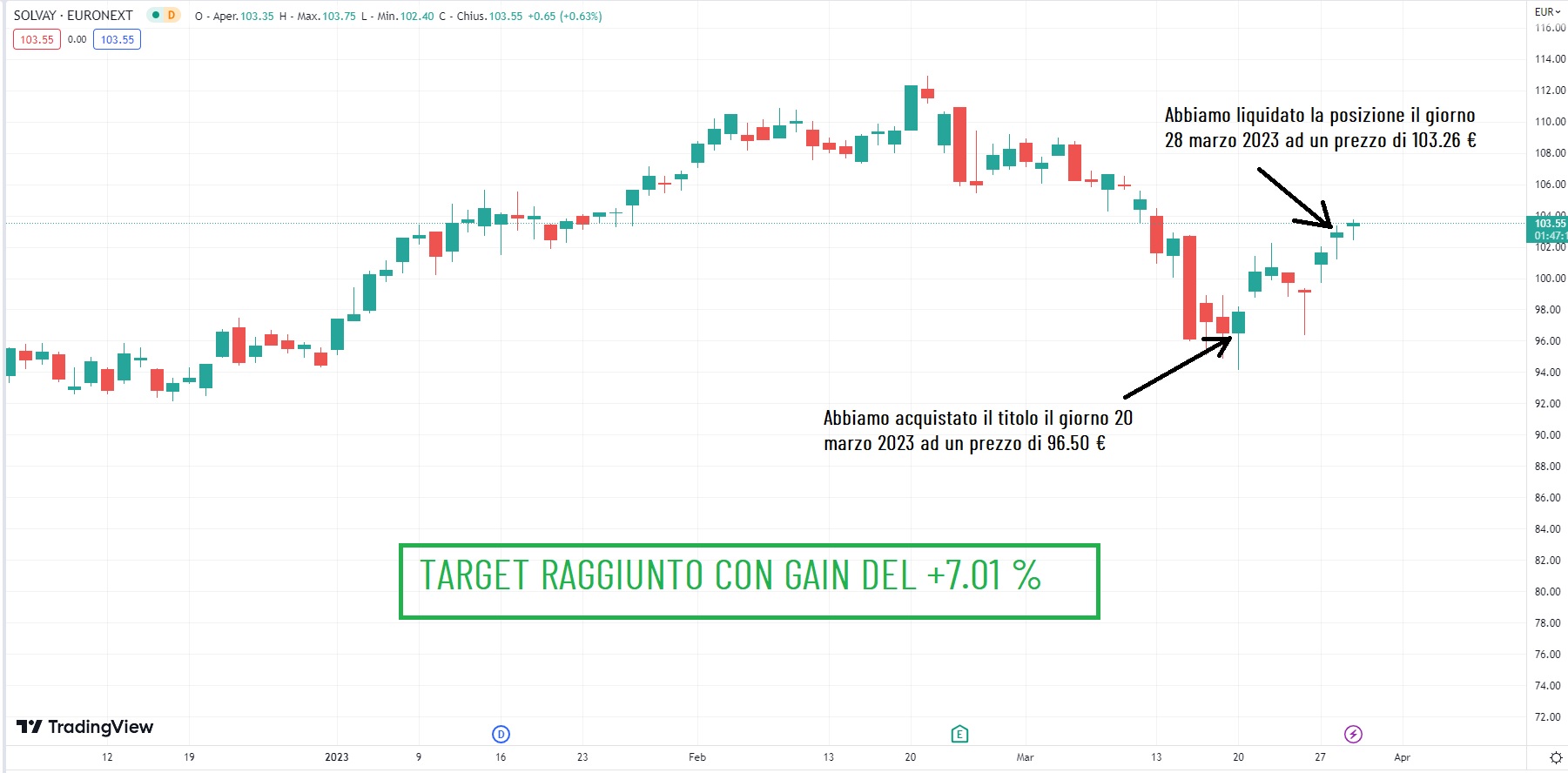 Siamo entrati sul titolo il giorno 20 marzo 2023 ad un prezzo di 96.50 € e solo dopo una settimana di contrattazioni abbiamo liquidato la posizione ad un prezzo di 103.26 €, guadagnando un ottimo +7.01 %.