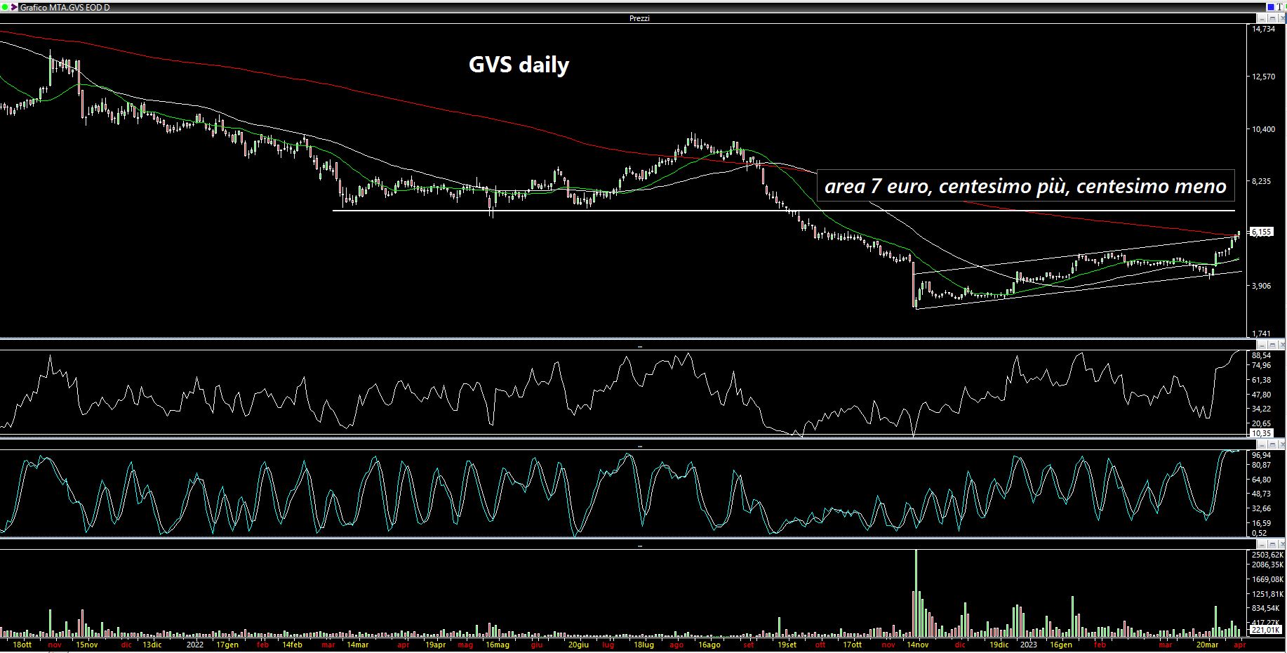 Movimento a dir poco esplosivo invece sulle azioni GVS di cui ho scritto sabato scorso: da 5.25 euro siamo saliti a 6.15. +17% sulla settimana anche se come Vi ho scritto nell'update infrasettimanale quando ci sono già rialzi attorno all'8-10% magari in una o due sedute è meglio iniziare a portare i remi in barca su una parte del trade (link: https://www.lombardreport.com/2023/3/29/azioni-gvs-azioni-amplifon-azioni-banca-popolare-di-sondrio-azioni-credem/). Il titolo rimane comunque ben impostato e non mi stupirebbe un ulteriore allungo a cercare l'area 7 euro. Rimaniamo comunque in una zona di resistenza (media a 200) e di ipercomprato di breve. Quando ho scritto la mia tesi sugli oscillatori che certamente conoscete meglio del sottoscritto, ricordo che avevo messo in evidenza il fatto che quando ci si trova in un trend ben delineato (al ribasso o al rialzo) occorrerebbe adattare le soglie di ipercomprato o ipervenduto verso l'alto o verso il basso. Detto questo partendo dal presupposto di avere già messo un pò di fieno in cascina su buona parte della posizione, utilizzerei un trailing stop cautelativo sul resto. Avere uno stop loss in pari sul punto di ingresso (area 5.20-5.25 euro) darebbe un pò di fastidio: non è il caso di lasciare al mercato il +17% fatto in una sola settimana anche se solo su metà posizione (visti i tempi, la fatica ed il periodo). Ergo: stop su tutto il resto a 5.60 euro market on close, a costo di rientrare su livelli più alti e/o su configurazioni grafiche interessanti. My point of view naturalmente: come sempre ciascuno ha il proprio trading plan e prende le proprie decisioni autonomamente!