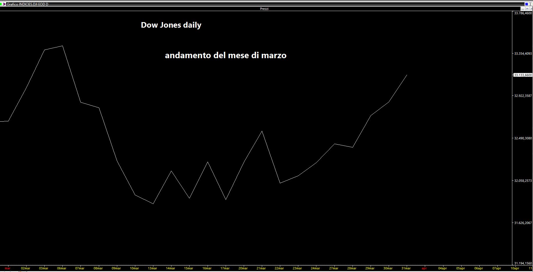 Nella realtà dei fatti il mese è stato positivo MA ci sono state discrete turbolenze. Il bottom è stato fatto verso la metà del mese e poi gli indici si sono assestati ed hanno ripreso un movimento a salire, almeno quelli statunitensi a cui lo studio è riferito. Questo il risultato finale sul Dow Jones: