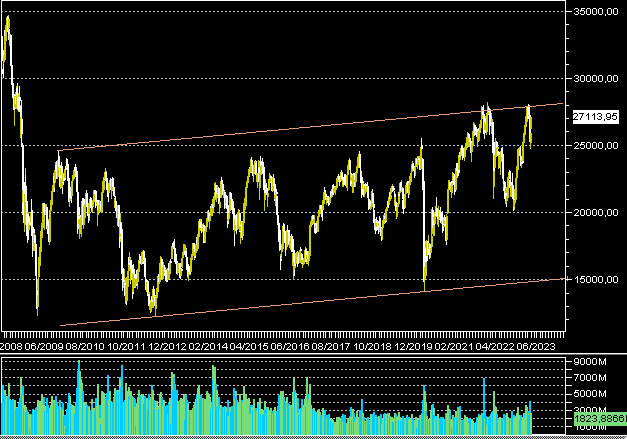 L'indice è in un canale ascendente che in questo decennio ha sempre trovato un motivo per stornare e tornare sulla parte bassa.