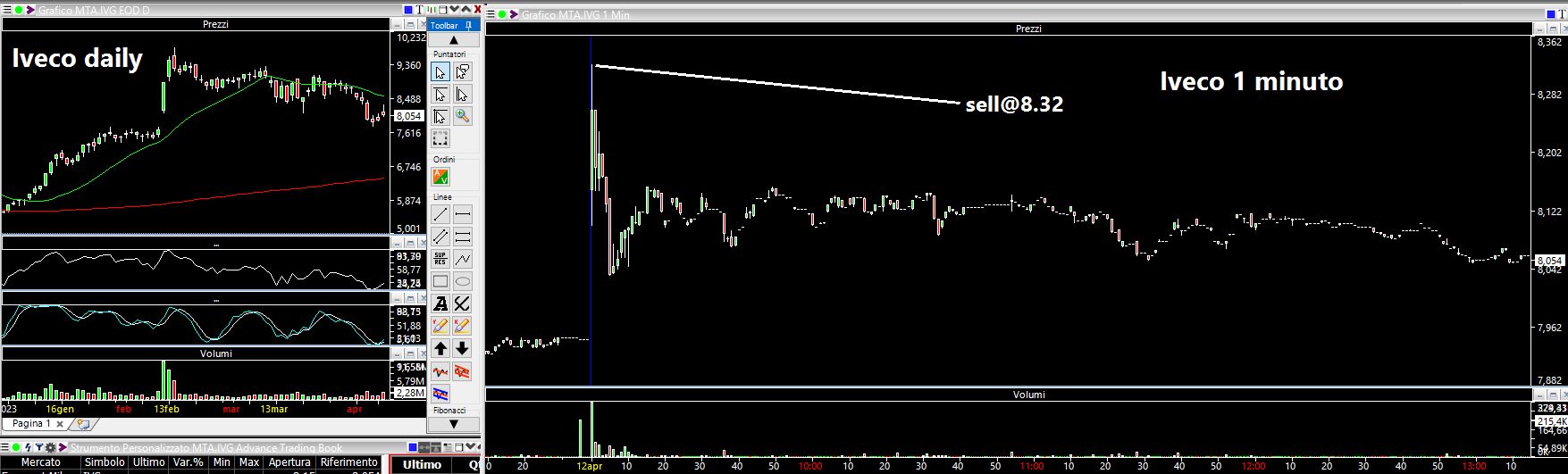 Sulla seconda, Iveco, stessa cosa: apertura a 8.15 euro e subito gli algoritmi che gonfiano artificialmente il bid del titolo revocando la lettera in modo da spingere i trader all'acquisto. Molto bene! Personalmente l'ho shortata in open a 8.15, chiusa subito a 8.15 non appena mi sono reso conto della turbativa di mercato in atto da parte dei software. Però non aveva senso la salita e quindi l'ho marcata stretta aspettando che qualche pesce uscisse dalle reti dei pescatori a strascico. Ed ecco che i software portano il titolo fino a 8.322 euro, oltre il 4% dalla chiusura di ieri. "Magicamente" quegli stessi software smettono di comprare e non si alzano più. Quel prezzo è stato il massimo di seduta che non è mai più stato rivisto nella seduta odierna. Riprovo dunque lo short esattamente in quel punto (senza senso grafico) ed ecco che solo pochi secondi dopo (neanche minuti!) gli algoritmi riportano l'azione dove doveva stare e sotto 8.15 euro, facendole segnare addirittura 8.04.