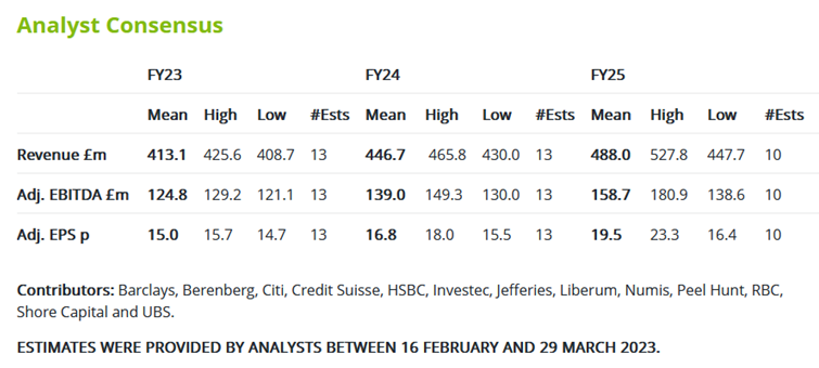 Il consensus medio prevede fatturato a £ 413,1 (+6, 5%) con € 124,8 di EBITDA (30,21% di marginalità).