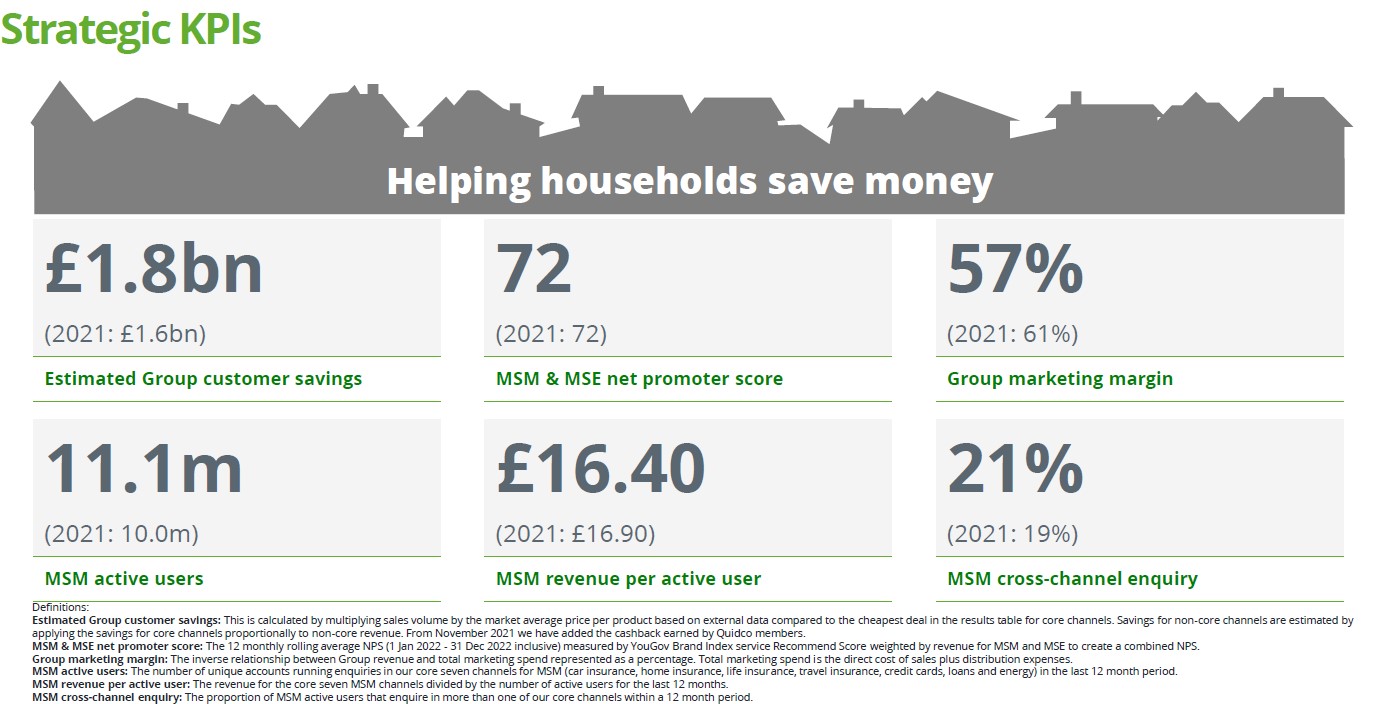 Trattandosi (spesso) di beni fungibili, riuscire a far risparmiare i clienti, a parità di servizio, rappresenta un ottimo “plus”. Questo aspetto, in uno scenario di forte inflazione, sembra aver avuto un ruolo ancor più rilevante. Giusto per fare due conti, nel 2022, MONEYSUPERMARKET ha limato i costi dei propri clienti di ben £ 1,8 mld.
