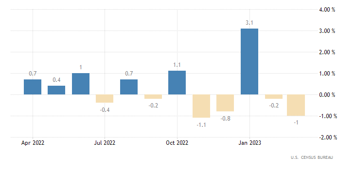 Il dato sulle vendite al dettaglio su base mensile per il secondo mese consecutivo è accompagnato dal segno ‘meno’. In particolare, le vendite al dettaglio a marzo su base mensile incassano un -1,0%, calo più marcato del -0,4% indicato dal consensus e superiore anche al -0,2% di febbraio (rivisto da -0,4%). Il dato è rilasciato dall’U.S. Census Bureau.
