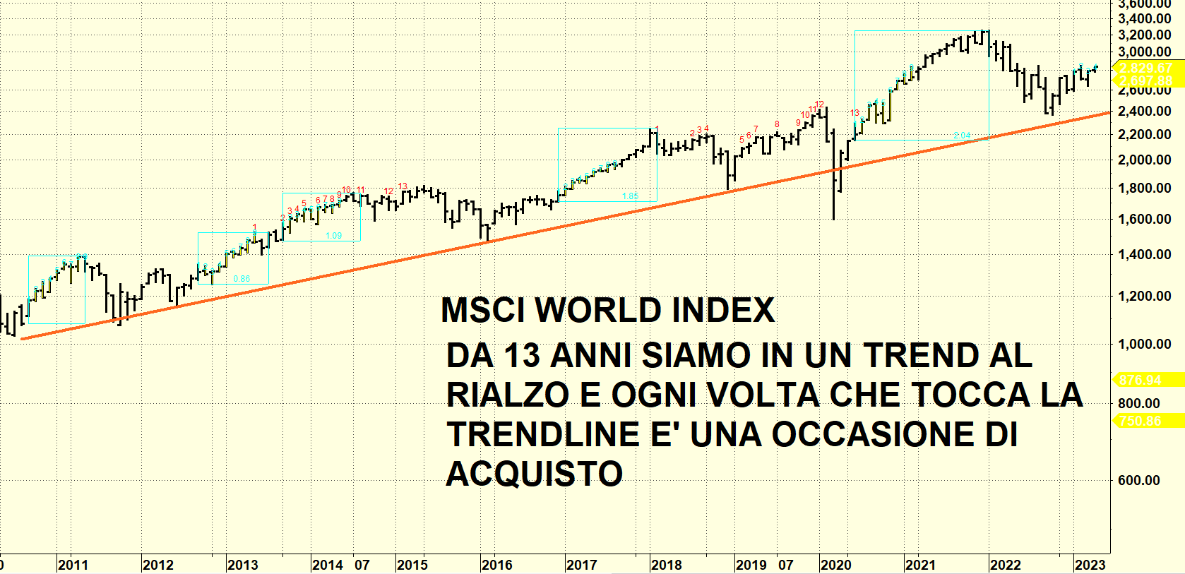 Il migliore indicatore da 20 anni a questa parte è il MSCI World Index che misura l’andamento dell’azionario e come si può notare siamo a cavallo della trendline che lo sorregge dal 2010 ad oggi. Quindi essendo a cavallo della trendline e con una faccia da bottom up mi aspetto più un rialzo che un ribasso o mal che vada una congestione.