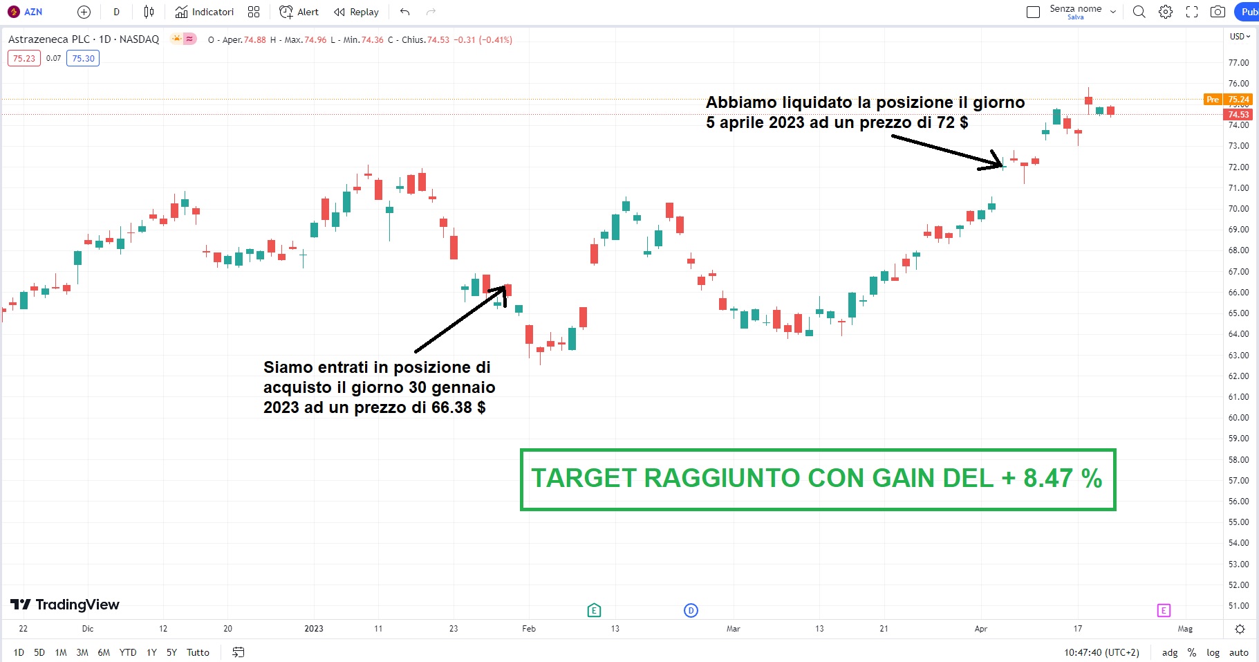 Come si può vedere dal grafico, il giorno 30 gennaio 2023 abbiamo acquistato il titolo sul mercato borsistico NASDAQ di New York al prezzo di 66.38 $. Dopo pochi giorni di contrattazione, il giorno 5 aprile 2023, il titolo è riuscito a toccare il nostro livello di target a 72.00 $ al quale abbiamo venduto guadagnando un ottimo +8.47 %, grazie anche ad un’apertura in gap up.