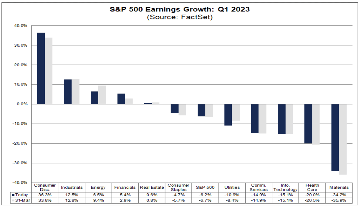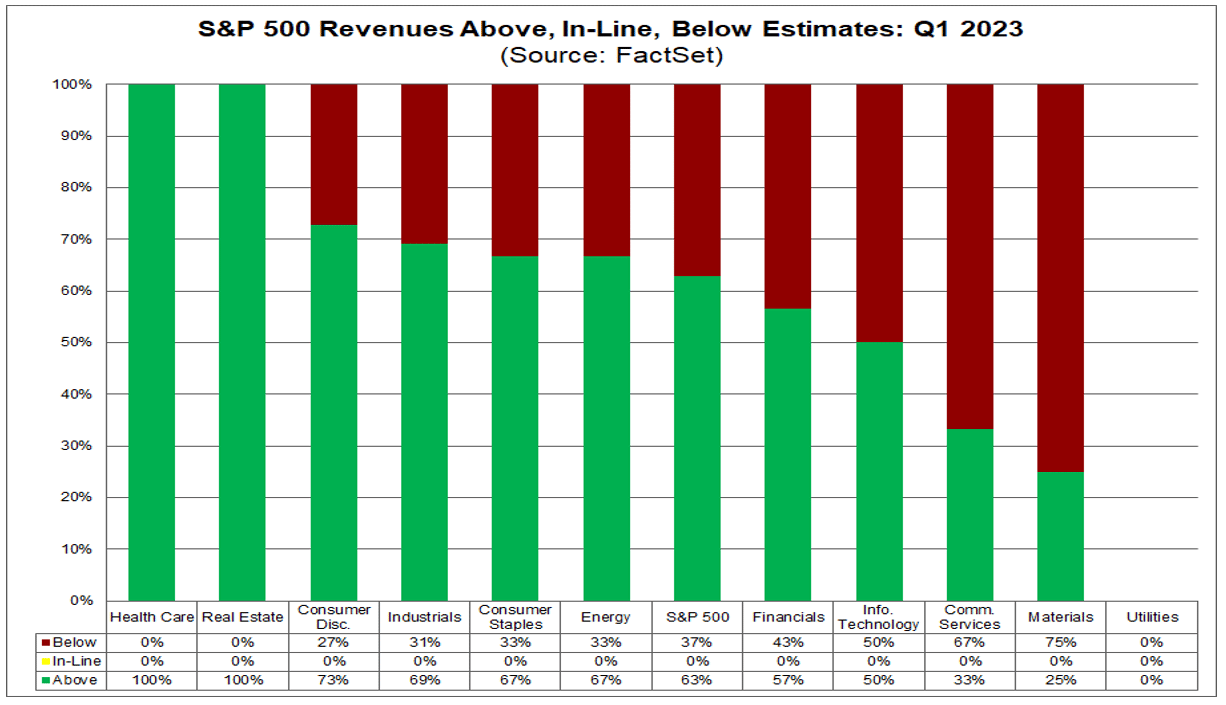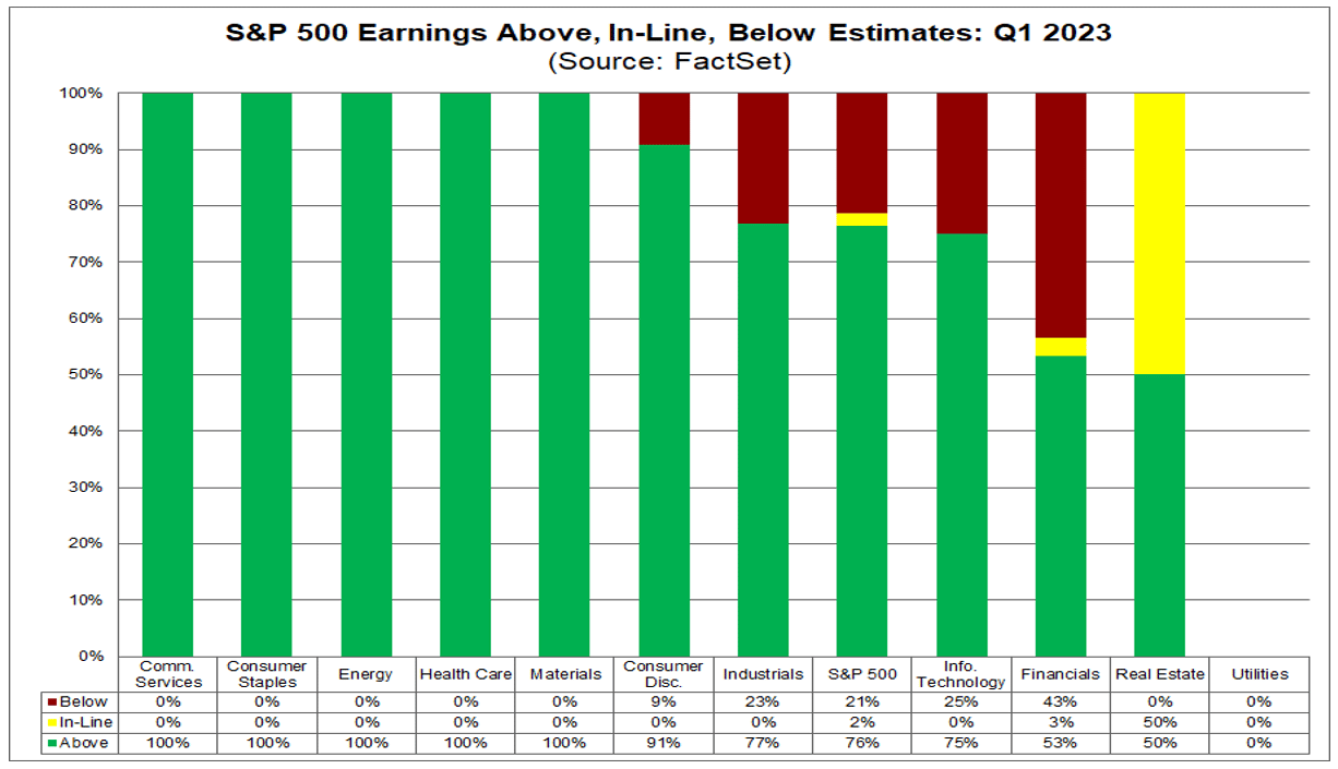 Complessivamente, il 18% delle società dell'S&P500 ha riportato risultati effettivi per il primo trimestre del 2023 fino ad oggi. Di queste società, il 76% ha riportato un utile per azione effettivo superiore alle stime e mediamente riportano una percentuale di utili superiori del 5,8% rispetto alle stime.