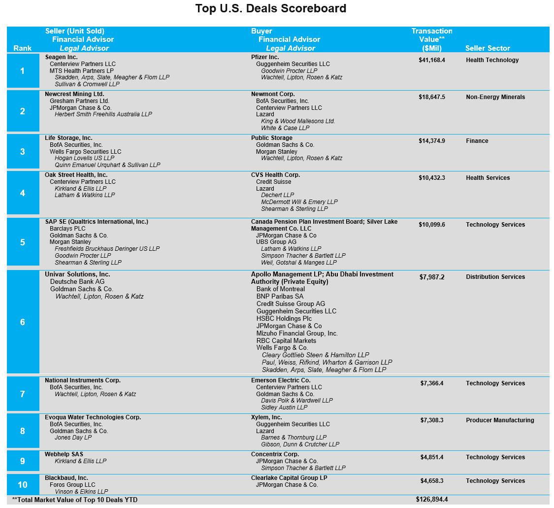 L'attività di M&A negli Stati Uniti è aumentata a marzo, con un aumento dell'1,4% con 1.146 annunci rispetto ai 1.130 di febbraio. Anche la spesa aggregata per fusioni e acquisizioni è aumentata. A marzo è stato speso lo 0,2% in più per le operazioni rispetto a febbraio. I cinque settori che hanno registrato il maggior calo del volume di operazioni di M&A (rispetto allo stesso periodo di tre mesi di un anno fa) sono stati: Finance (547 vs. 1091), Technology Services (714 vs. 1091), Commercial Services (541 vs. 716), Servizi Sanitari (148 vs. 239) e Servizi di Distribuzione (209 vs. 289). In cima alla lista delle più grandi operazioni annunciate a marzo ci sono: l'accordo di Pfizer Inc. per l'acquisizione di Seagen Inc. per 42,8 mld $; un gruppo privato guidato da Canada Pension Plan Investment Board e Silver Lake Management Co. LLC stipula un accordo per acquisire la restante quota del 95,9% in Qualtrics International, Inc. da SAP SE per 10,5 mld $; un gruppo privato guidato da Apollo Management LP e Abu Dhabi Investment Authority che stipula un accordo per l'acquisizione di Univar Solutions, Inc. per 5,6 mld $; l’accordo di Concentrix Corp. per acquisire Webhelp SAS per 3,2 mld $; la proposta di Clearlake Capital Group LP di acquisire Blackbaud, Inc. per 3,8 mld $ (v.grafico).