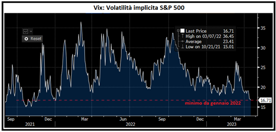 Ma dove si sono visti i livelli più interessanti è stato sulla volatilità, con Vix e Vstoxx che hanno marcato i minimi da inizio 2022. Sopra 16 vol, non si può dire che il Vix sia eccessivamente basso. La mediana del decennio 2010-2019 è stata circa 13 punti. Post Covid la volatilità implicita si è un po' alzata in media, ma nel 2021 si è comunque attestata attorno ai 15/16 punti nel periodo più tranquillo. Certo, fare i minimi a 15 mesi in una fase come questa, con i postumi di fallimenti bancari in US e EU, con la stagione delle trimestrali economiche che sta per entrare nel vivo, la volatilità sui bonds elevata e le curve pesantemente invertite, sembra davvero un miracolo.