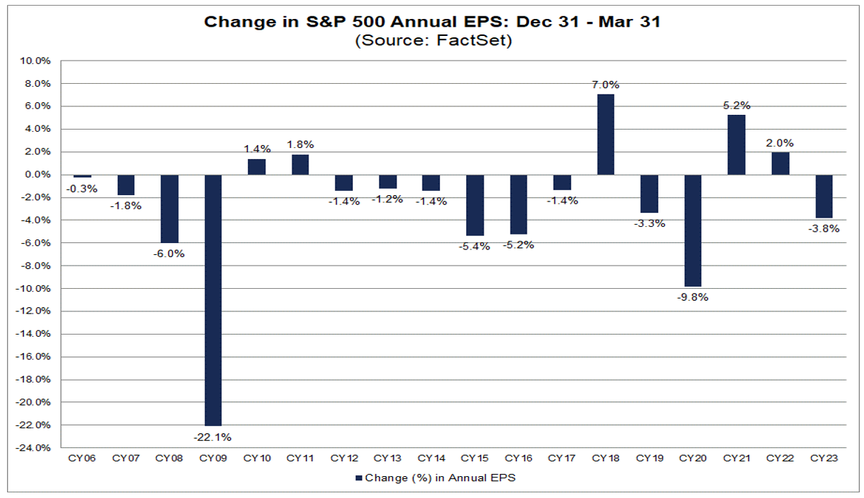 Date le continue preoccupazioni del mercato sulla liquidità bancaria e una possibile recessione economica più ampia, gli analisti hanno abbassato le stime degli utili più del normale per le società dell’S&P500 per il primo trimestre 2023. La stima degli utili bottom-up del primo trimestre (che è un'aggregazione delle stime degli utili mediane per il primo trimestre 2023 per tutte le società dell'indice) è diminuita del 6,3% (a 50,75 da 54,13 $/az.) dal 31 dicembre al 30 marzo: