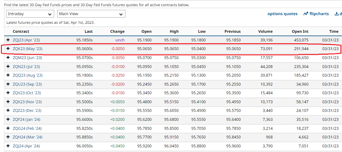 A livello di mercato monetario, se l'azionario è tornato sui livelli pre-crisi bancaria di inizio marzo, lo stesso non si può dire del mercato dei tassi. Interessante notare che la Fed Fund strip di marzo si chiude con una Fed Fund Strip che sconta il 55% di probabilità di un ultimo rialzo a maggio e dopo, 2 tagli da 25 bps entro la fine del 2023.