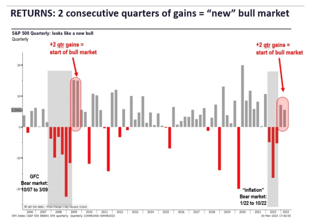 Come riportato nel titolo di questo foglio, con venerdì scorso si è chiuso il secondo trimestre positivo di seguito per i listini azionari USA, dopo il quarto trimestre del 2022. In molti hanno notato che 2 trimestri positivi di seguito non si sono visti in un mercato ribassista negli ultimi 50 anni, e quindi questa azione dei prezzi indica che siamo in un nuovo mercato rialzista (o bull market), iniziato ad ottobre scorso (v. grafico):