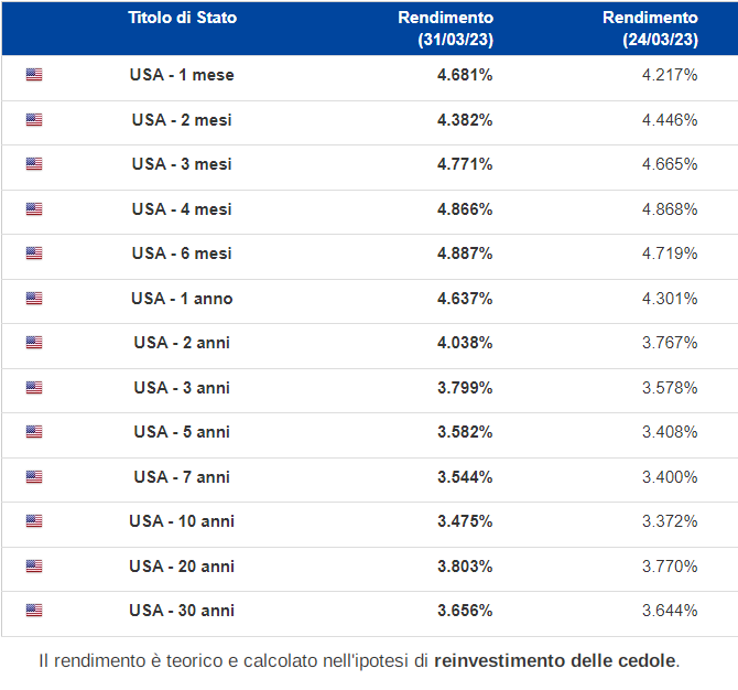 Anche i movimenti sui tassi hanno risentito della positività venuta dal settore bancario galvanizzati dall'acquisto di parte degli asset di SVB da parte di First Citizens, con il settore delle banche regionali su del 2.5%. Il rimbalzo dei rendimenti è stato molto più forte, con salite di 22 bps per il Treasury 2 anni e di 14 bps per il 10 anni per poi ripiegare nel fine settimana (in coincidenza con il dato sull’inflazione PCE Deflator) con il 10 anni sul livello di 3.471% quasi 53 bps sotto il livello del 9 marzo, data di scoppio della crisi, e il 2 anni intorno al 4.029% ben 105 bps sotto i livelli di 3 settimane fa.