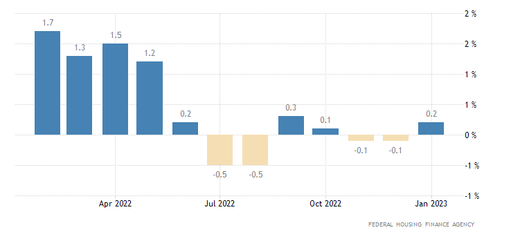 L’indice di prezzo delle case, invece, a livello mensile a gennaio ha realizzato una crescita dello 0,2%, in direzione opposta rispetto ad un dato di dicembre e novembre del -0,1%. Il dato è rilasciato dall’Office of Federal Housing Finance Agency.