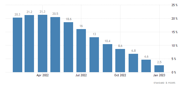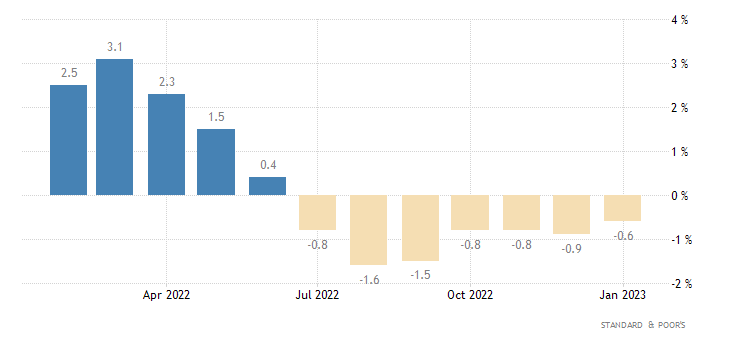 L’S&P/Case-Shiller Home Price Index rilasciato da Standard & Poor’s, che valuta le variazioni nel valore del mercato immobiliare residenziale in 20 regioni degli USA, a livello mensile a gennaio perde uno 0,6% (settimo mese consecutivo con il segno ‘meno’), contrazione più contenuta del -0,9% di dicembre.