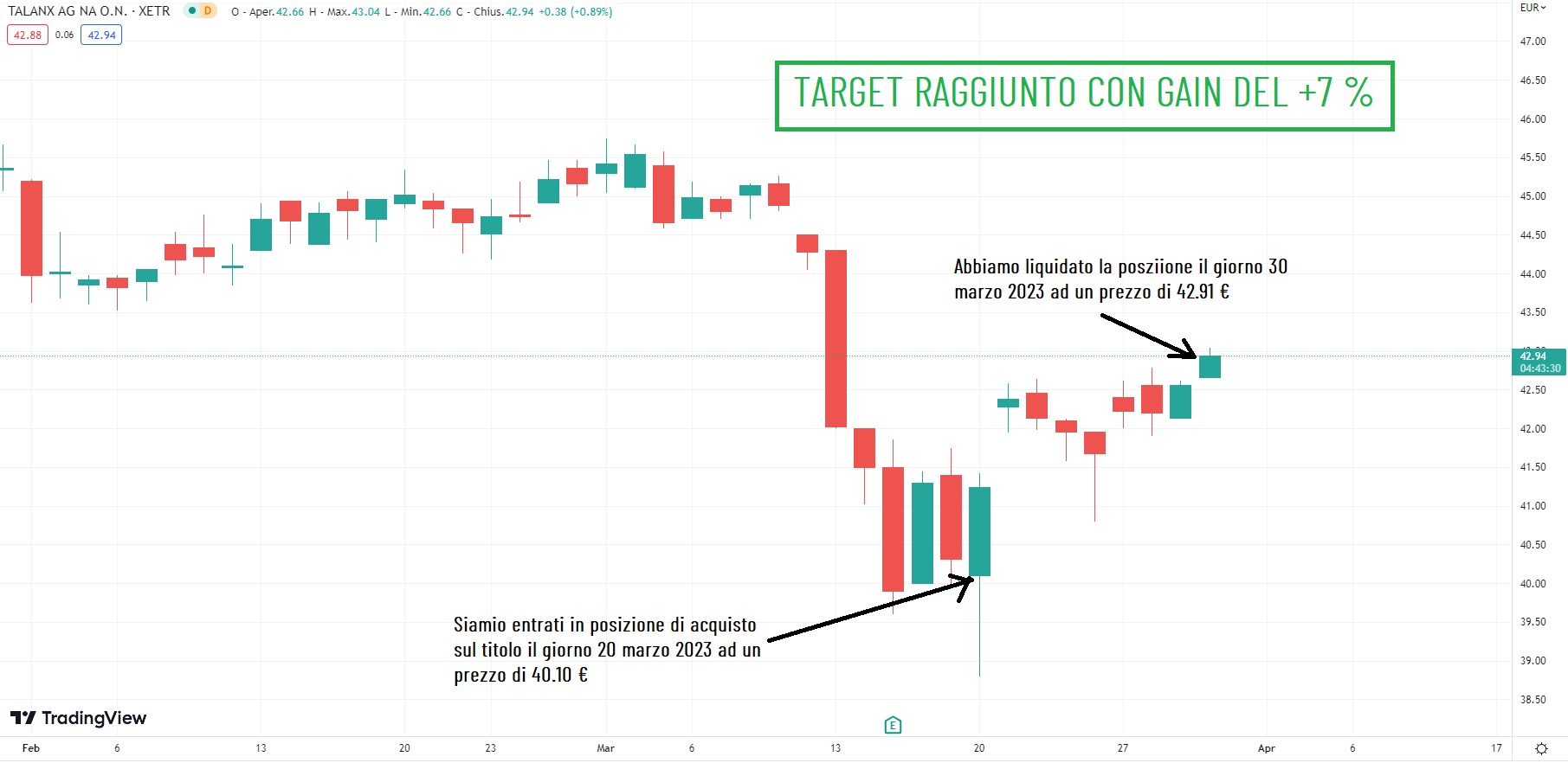 Come potete vedere dal grafico il giorno 20 marzo 2023 abbiamo acquistato il titolo ad un prezzo di 40.10 € e dopo esattamente 9 giorni di contrattazione, il giorno 30 marzo 2023, il titolo è riuscita a toccare il nostro livello di target a 42.91 € al quale abbiamo venduto e guadagnato un ottimo +7 %