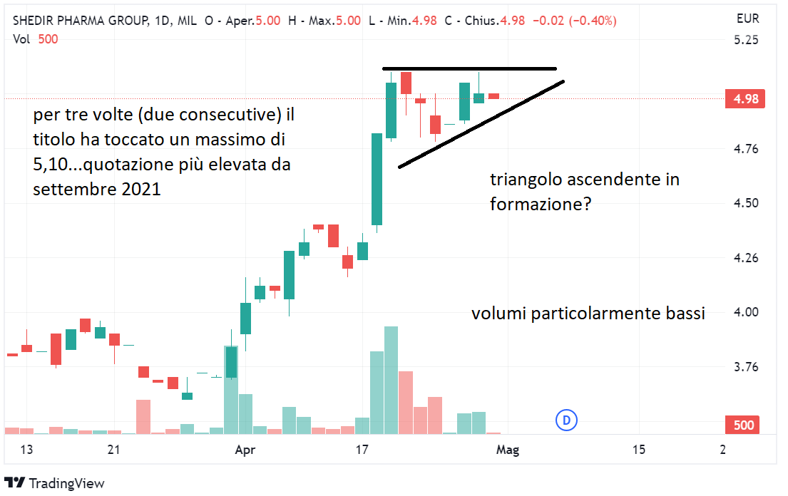 Da segnalare subito che si tratta di un titolo con volumi particolarmente bassi. Quello presente ora sul grafico potrebbe essere un triangolo ascendente in formazione. Entrando nello specifico, già tra fine marzo ed inizio aprile le quotazioni hanno intrapreso un movimento rialzista, movimento che ha subito un’ulteriore spinta verso l’alto nelle sedute del 18 e 19 aprile (tra l’altro in data 18 aprile sono stati comunicati i ricavi netti consolidati del primo trimestre 2023). Con le sedute del 19 e 20 aprile il titolo ha toccato per due volte il massimo di 5,10, quotazione più alta da settembre 2021. Tale quotazione rappresenta anche il primo massimo del triangolo ascendente in formazione, composto a seguire dal minimo di 4,78 del 24 aprile, dal secondo massimo sempre di 5,10 del 27 aprile. Si nota anche un forte aumento dei volumi tra il 18 e il 24 aprile.