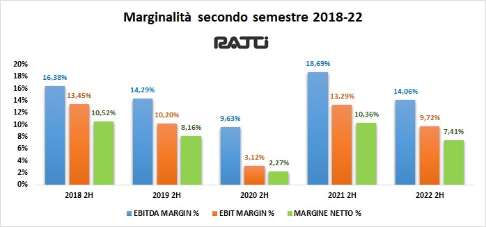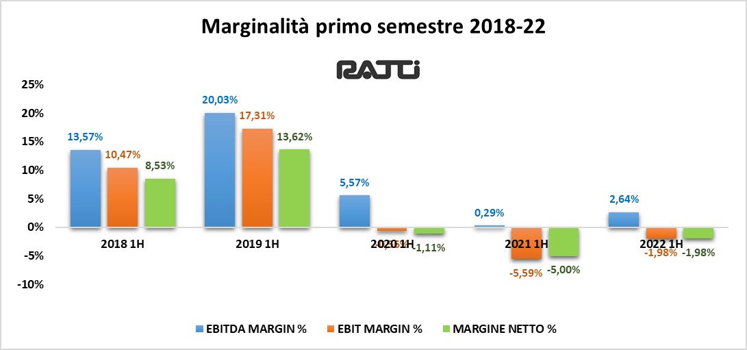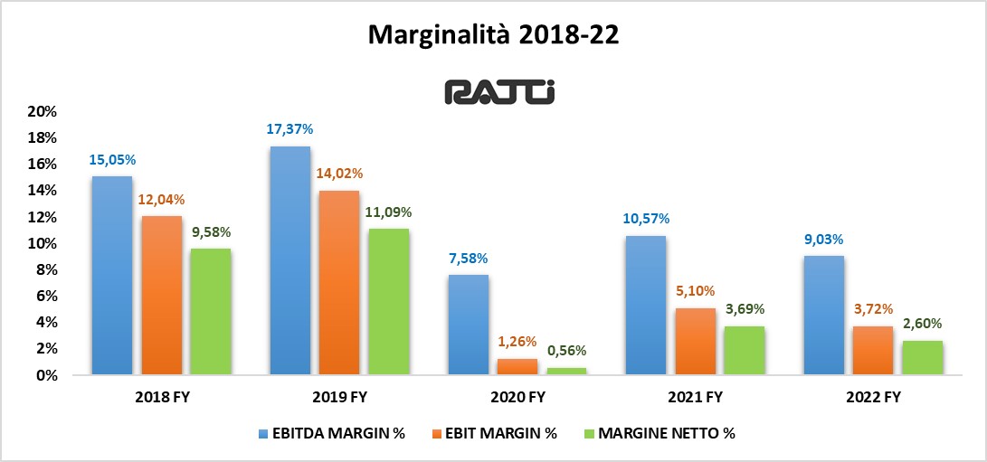 Lo scenario decritto sui ricavi, trova riscontro anche sotto l'aspetto della marginalità. RATTI, nel 2022 ha presentato risultati più o meno in linea con quelli riportati nel 2021. Tenendo conto dello scenario inflattivo, questo aspetto potrebbe rappresentare anche un elemento positivo, ma analizzando il passato emerge che, la strada del recupero, sia ancora lontana dal raggiungimento del livello pre-pandemico.