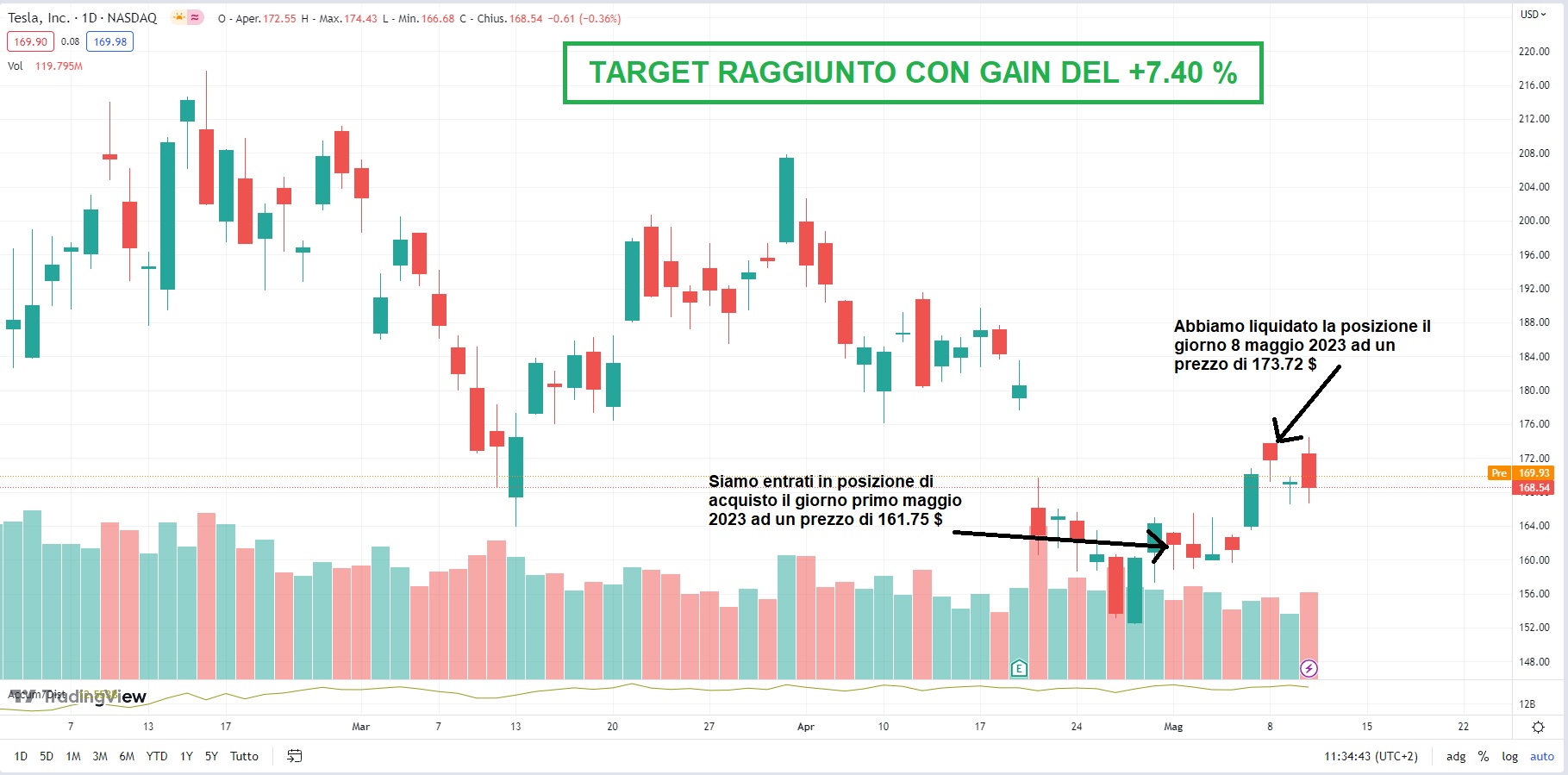 Siamo entrati in acquisto del titolo lo scorso primo maggio 2023 ad un prezzo di 161.75 $ e dopo solo 6 giorni di contrattazione abbiamo liquidato la posizione, il giorno 8 maggio 2023, ad un prezzo di 173.72 $.