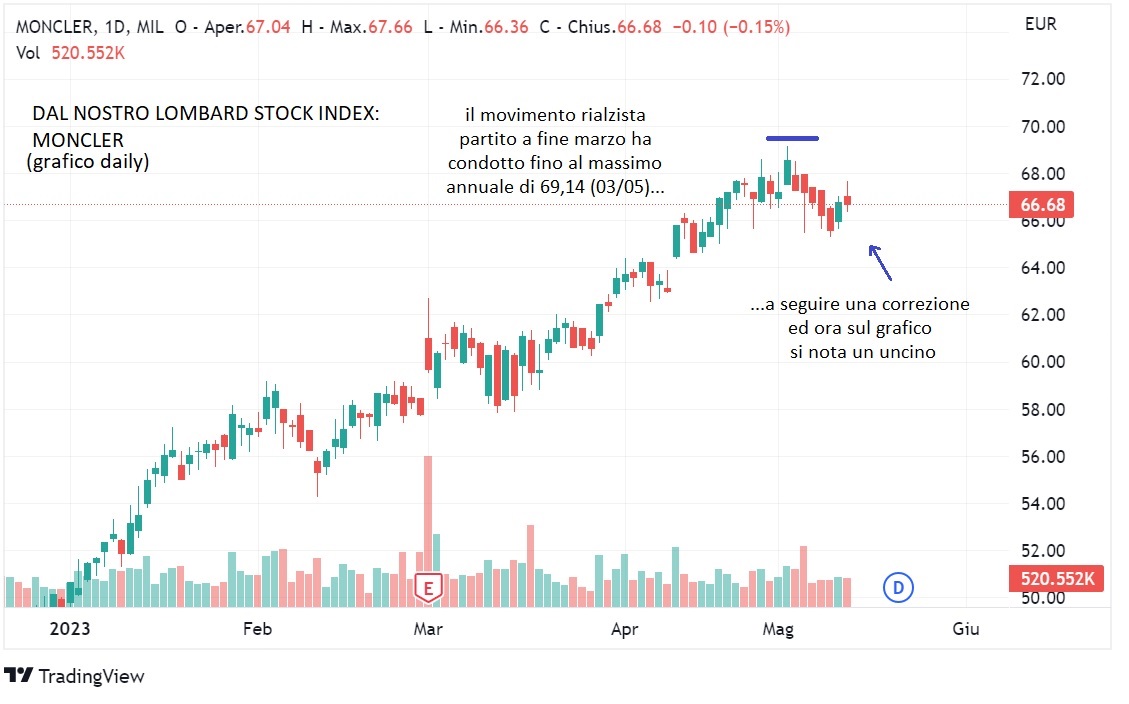 Andiamo ad analizzare il grafico di Moncler, titolo che recentemente ha toccato il proprio massimo annuale per poi realizzare un uncino; dall’analisi grafica, passiamo poi all’analisi fondamentale