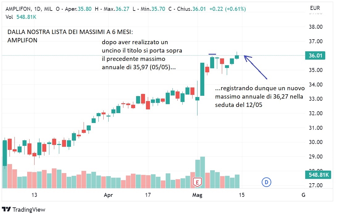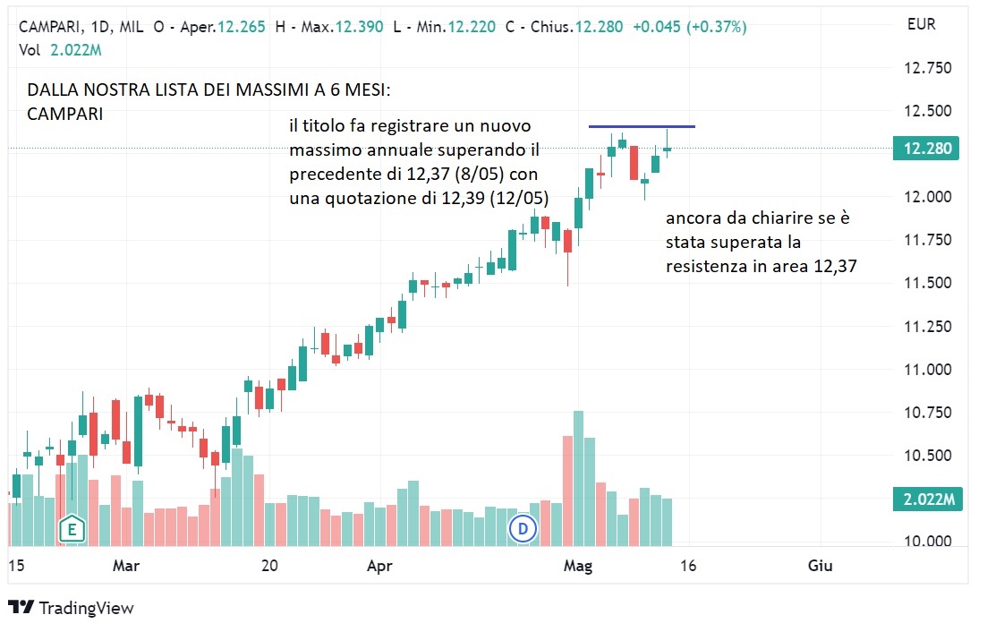 Ecco l'analisi grafica di due titoli che hanno recentemente fatto registrare nuovi massimi annuali: azioni Campari ed Amplifon. Entrambi i titoli sono stati selezionati dalla nostra lista dei massimi a 6 mesi: