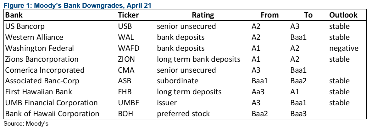 Una nuova ondata di declassamenti del credito bancario. Il 21 aprile, Moody's ha declassato diverse banche, tra cui Western Alliance e First Republic. L'elenco completo contiene un gruppo ormai familiare di banche che erano tra le peggiori performance a metà marzo, riflettendo preoccupazioni particolarmente elevate per i depositi non assicurati e le perdite non realizzate (v. grafico):