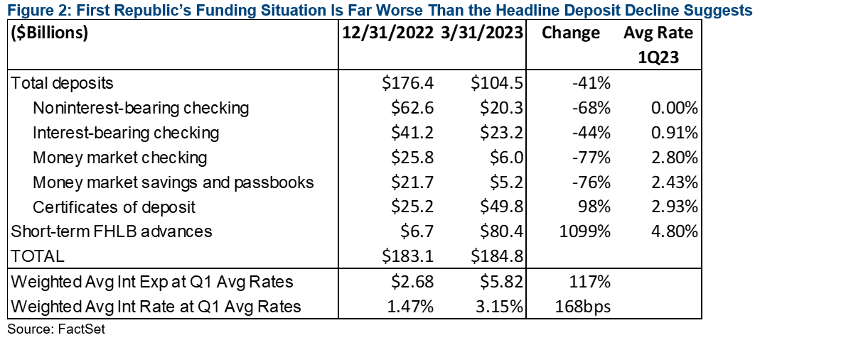 La situazione dei finanziamenti è di gran lunga peggiore di quanto suggeriscano i deflussi di depositi principali. I depositi totali della First Republic sono diminuiti del 41% nel primo trimestre, e questa è la buona notizia. La notizia meno buona è che questo include i 30 mld $ depositati da 11 concorrenti apparenti, ma in assenza di quell'afflusso aberrante, i depositi totali da parte dei clienti effettivi sono diminuiti del 58% dalla fine del 2022. I depositi infruttiferi sono diminuiti del 68% e il buco è stato colmato dai CD (deposit certificates) in aumento del 98% con un tasso medio del 2,93% nel primo trimestre e dalle anticipazioni FHLB (Federal Home Loan Bank) a breve termine, in aumento di 10 volte, con un tasso medio del 4,80% nel primo trimestre. Anche mantenendo invariati i tassi del primo trimestre, il solo cambiamento di mix raddoppia effettivamente i loro costi di finanziamento.